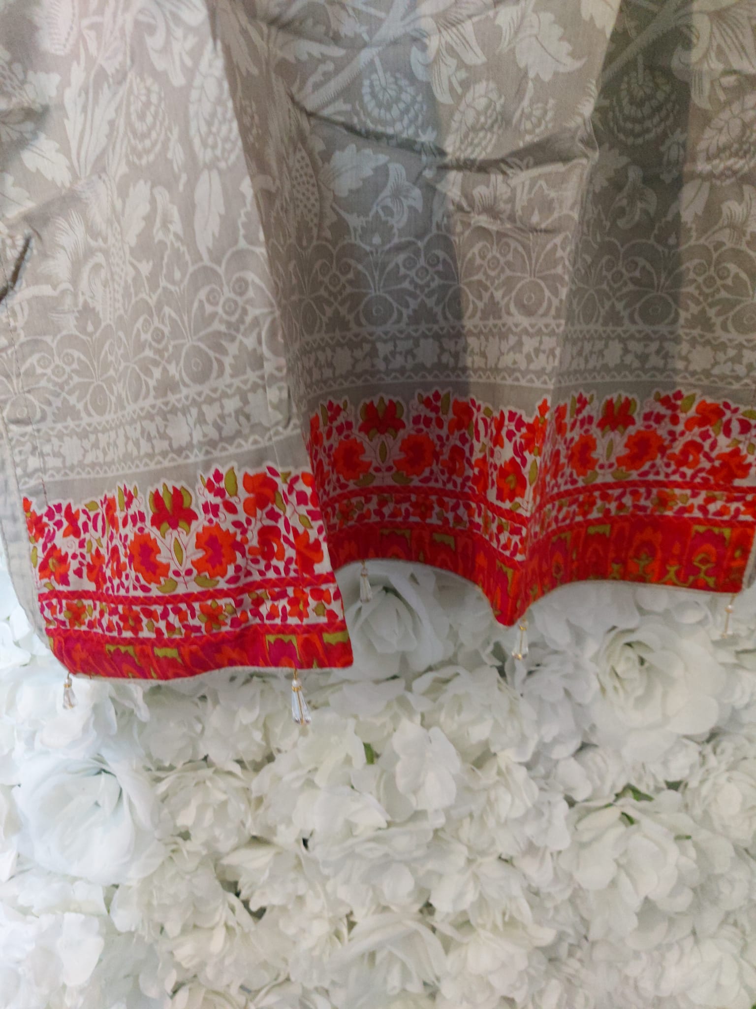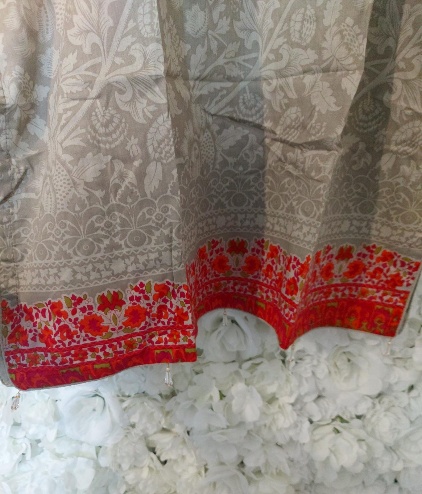 Light and dark grey Floral print kurta with red and orange heart shape/floral Embroidered Neckline. floral print front bottom border with white and clear long pyramid design Beads.